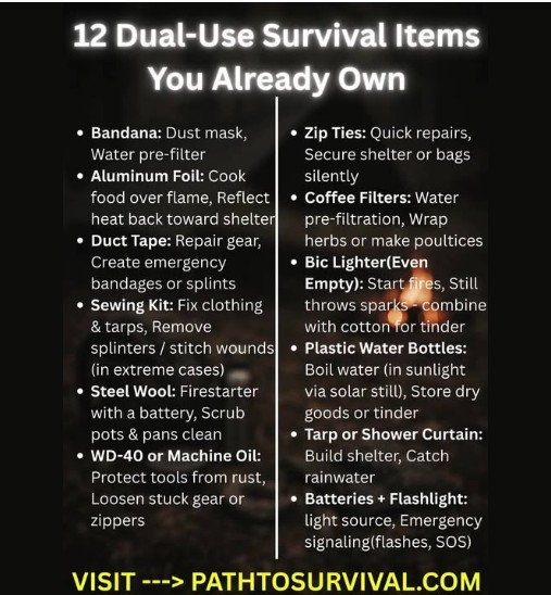 “12 dual-use survival items you likely already own: Bandanas work as dust masks and water filters. Aluminum foil cooks food and reflects heat. Duct tape repairs gear and makes bandages. Sewing kits fix clothes and remove splinters. Steel wool starts fires and cleans pots. WD-40 protects tools and loosens gear. Zip ties secure shelter and repairs. Coffee filters purify water and wrap herbs. Bic lighters start fires, even empty. Plastic bottles boil water and store goods. Tarps build shelter and catch rain. Batteries with flashlights provide light and signals”