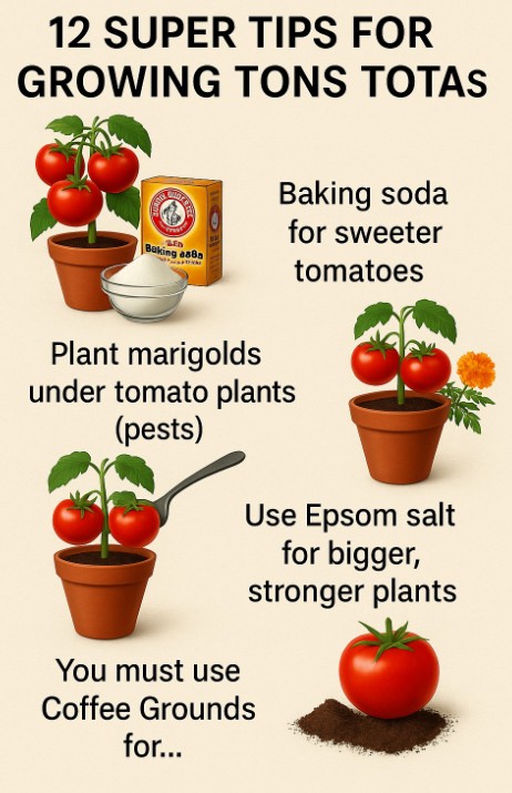 “This is a repost, good info for fellow gardeners. Sweeten tomatoes with baking soda, deter pests with marigolds, and feed plants Epsom salt & coffee grounds. Mulch to retain moisture, prune low leaves, and plant deep for strong roots. Use compost tea, stake early, water regularly, choose the right variety, and rotate crops yearly. Natural, proven methods for bigger harvests and sweeter tomatoes!”