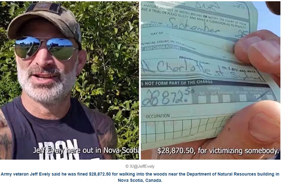 Retired Canadian Armed Forces veteran Jeff Evely was fined $28,872.50 for walking into the woods in Coxheath, Nova Scotia, near the Department of Natural Resources. Evely shared a video showing him politely telling conservation officers he planned to enter the woods despite warnings. Moments later, he was issued the massive fine. He called it proof of Canada’s dystopian state, sparking social media praise and debate over government overreach.