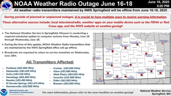 “All NOAA weather radio transmitters maintained by NWS Springfield are offline June 16–18 for upgrades. It’s crucial to have multiple ways to get warnings—use local TV/radio, weather apps, or check weather.gov/sgf. Stay alert and spread the word! Full info here: PDF Notice”