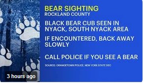 Home | Group Discussions | Top Stories | Top Reports | Top Postings | Add a Report Community and Social Reports← BackBear cub roams Nyack, sparking safety warnings 9 months ago01 mins A black bear cub was spotted in Nyack, prompting safety warnings. The cub was seen in the Nyack Plaza area Sunday and Monday, police said. Neighbors also reported sightings on Haven Court in South Nyack. Click Here for More Information Post navigation Previous: Senator Cotton proposes study to streamline food safety oversightNext: Air Canada ditches more winter flights to U.S. as Canadian travel continues steep decline Leave a Reply Cancel replyYou must be logged in to post a comment.