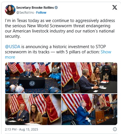 Secretary of Agriculture Brooke Rollins announced plans for a new facility near Edinburg, Texas, designed to produce 300 million sterile flies per week. The facility aims to combat the New World screwworm, a serious livestock pest, and is expected to begin production within one year, providing a significant boost to agricultural biosecurity and pest control efforts in the region.