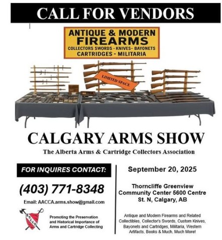 Calling all vendors! Donβt miss the Calgary Arms Show on September 20, 2025, at Thorncliffe Greenview Community Center. Showcase your antique & modern firearms, swords, knives, bayonets, cartridges, and militaria. Limited vendor space available! Contact (403) 771-8348 or email AACCA.arms.show@gmail.com to reserve your spot. Join us in promoting the preservation and history of arms and cartridges.