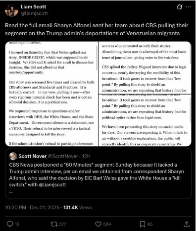 CBS News editor-in-chief Bari Weiss pulled a planned 60 Minutes segment on an El Salvador maximum-security prison holding Venezuelan migrants sent by the Trump administration, reportedly over the lack of government comment. Veteran correspondent Sharyn Alfonsi called the move political, not editorial, noting the story was vetted and legally cleared—warning it risks turning journalism into a mouthpiece for the state.