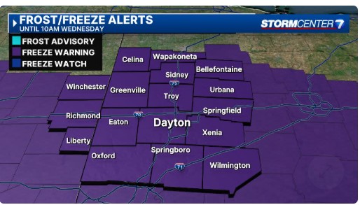 Freeze warnings and frost advisories are in effect in Ohio. Overnight temps are expected to dip into the 20s – 30s, which could be damaging to early spring crops and budding plants.