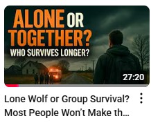“pass along! Great new video from Reliable Prepper—one of the best out there! “Lone Wolf vs. Group Survival: The Ultimate Showdown” dives into SHTF strategies, real-world scenarios, and the psychological impact of each approach. A must-watch for anyone serious about prepping.”