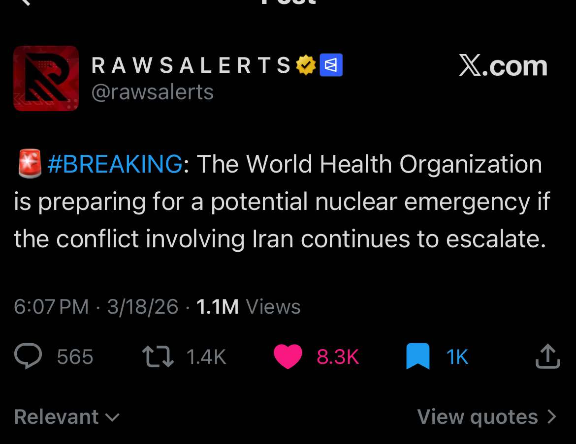 Home | Group Discussions | Prepper Watch | Prepper Watch Reports | Postings | Events | Add Report | Add Posting Community and Social ReportsConspiracy Theory ReportsEmergency Preparedness ReportsGov and Military ReportsHealth and Medical Reports← BackMake sure you’re staying tuned, it’s like a wave out there. 4 days ago01 mins https://x.com/rawsalerts/status/2034391191131721865?s=46 Post navigation Previous: Canada’s Rent Boom Is About to BreakNext: 25 Poor Man Meals From The Great Depression You Need To Try Leave a Reply Cancel replyYou must be logged in to post a comment.