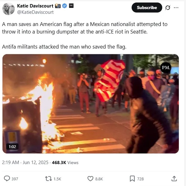 A man in Seattle seized an American flag from Mexican-nationalist rioters trying to burn it during anti-ICE unrest. Despite being attacked, he stopped them from tossing it into a burning dumpster. Riots erupted in multiple cities after ICE operations, first flaring in L.A. Post-Millennial’s Katie Daviscourt captured the moment, stating, “Antifa militants attacked the man who saved the flag.”