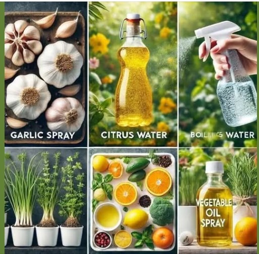 Garlic Spray: Soak 5 chopped garlic cloves in 0.5L water (12 hrs), add 2 tsp dish soap, strain, mix with 1L water, and spray.