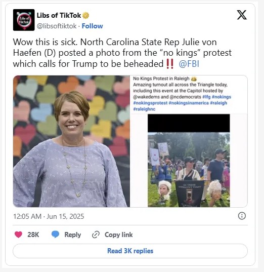 RALEIGH, NC — Rep. Julie von Haefen sparked outrage at a “No Kings” protest by holding an effigy of what appeared to be the decapitated heads of Donald Trump and Stephen Miller. “Amazing turnout all across the Triangle today,” she wrote on Facebook, tagging @wakedems and @ncdemocrats and using hashtags like #nokings and #raleighnc. The protest, held at the Capitol, drew strong reactions online, with critics calling the display “grotesque” and “dangerous political theater.”