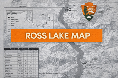 This PDF is a Ross Lake trip planner and campground access map for North Cascades National Park, focused specifically on the Ross Lake National Recreation Area. It combines a large-scale topographic map with a detailed campground reference table, making it both a navigation tool and a logistical planning guide for backcountry and water-based travel.