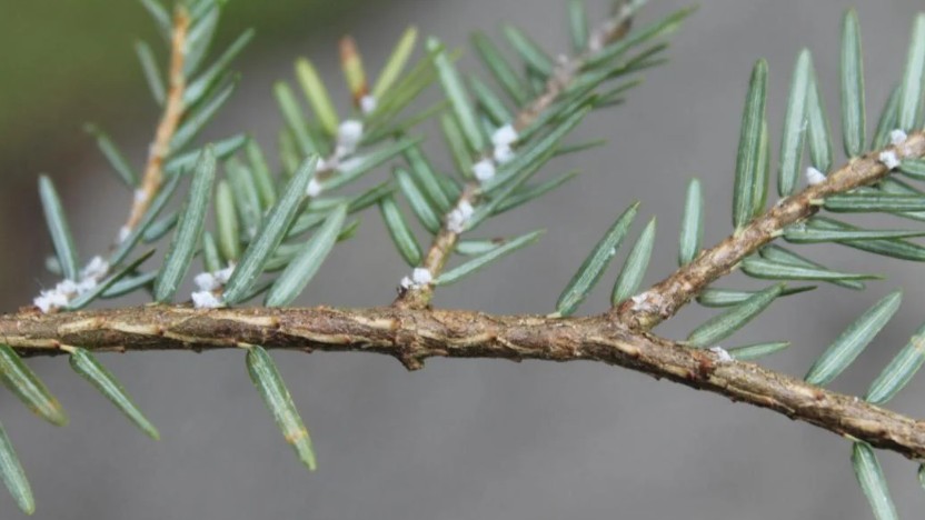 Hemlock woolly adelgid attacks and kills hemlock trees by attaching to branches and feeding at the base of needles, robbing the tree of nutrients and sap.