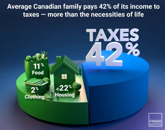 A new report shows the average Canadian family paid 42.3% of its income in taxes in 2024—more than on housing, food, and clothing combined (35.5%). The Fraser Institute’s 2025 Canadian Consumer Tax Index found that a typical family earning $114,289 paid $48,306 in taxes. According to director Jake Fuss, taxes remain the single largest household expense in Canada.