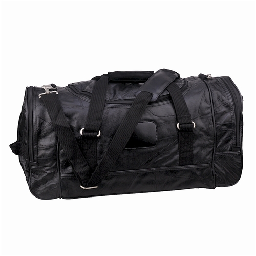 100% Genuine Leather (patched) 21″ Duffle Bag This 21″ genuine black leather duffle/tote bag is made of 100% genuine leather. The patched leather is soft and comfortable giving a worn feeling from the moment you start using your new duffle bag. This quality leather duffle bag features ergonomic zipper pulls which easily glide open, padded handles, 4 no-slip feet on the bottom and a detachable padded shoulder strap. The bag itself is roomy with plenty of storage space. The main zippered compartment is large enough for a weekend worth of clothes and personal items. There is zippered side pocket to the left with a ventilation area. On the right is a full size zippered pocket as well as a smaller full mesh zippered pocket. This leather duffle bag measures 21″ Long, 10″ Wide and 11″ High.