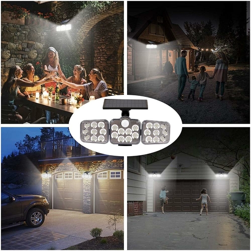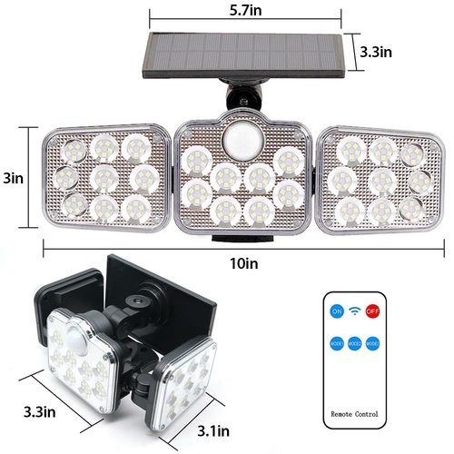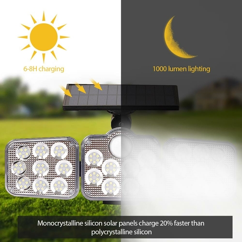 【138 LEDs and 270º lighting】 The solar outdoor lights is built in with 138 bright LEDs and has 3 adjustable heads ensuring that it can deliver ultra-high brightness illumination for wide area. The 270ºrotatable angle makes it very flexible to adjust the angle and get the solar panel much sunlight power at a maximum degree.