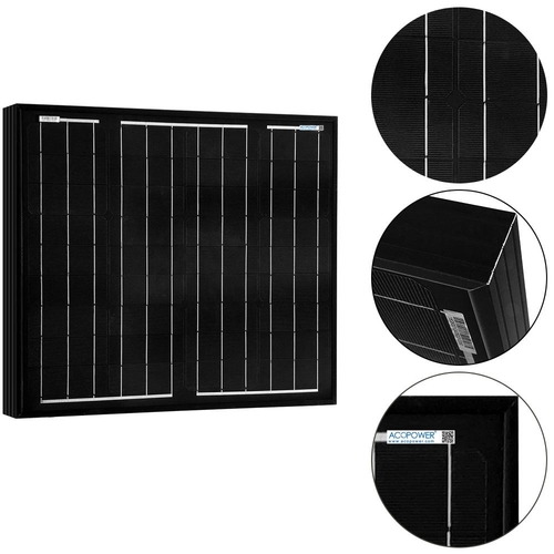ACOPOWER High modules conversion efficiency 50W mono solar panel providesup to 50W power. Easy installation with pre-drilled hole. Each solar panel comes with 12AWG cable with MC4 Male/female quick Connectors. Basic component for off-grid solar panel 12V/24V/36V/48V system, Caravan, RVs, cars, boats, green house solar systems.