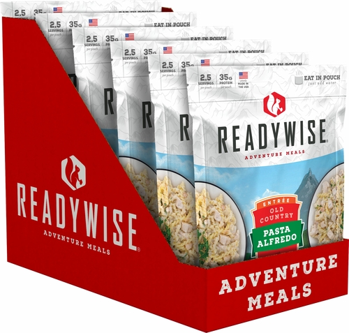 Each pouch of Old Country Past Alfredo with chickebn contains 2.5 servings and is resealable. These pouches are lightweight making the easily portable for any outdoor adventure. Just add water and you can eat directly from the pouch.