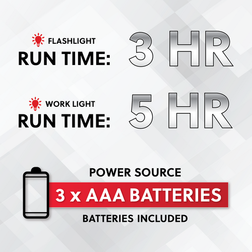 - Runtime: Flashlight 3H, Work light 5H