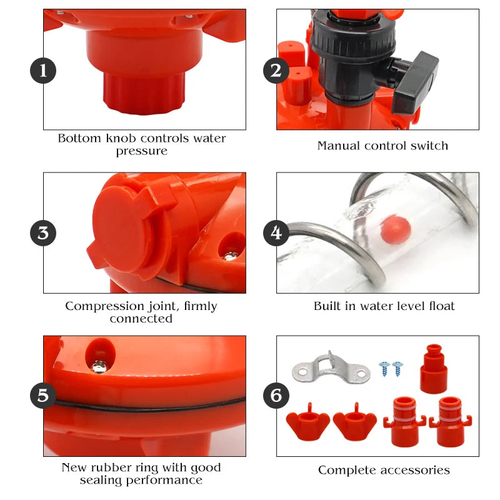 2.Water level indicator tube to increase or decrease the water level every 100mm, nipple drinkers will increase or decrease the amount of water 8-10ml / min