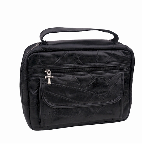 Genuine Leather Bible Cover This handsome bible book cover is large enough for most any standard book or Bible. This black leather bible cover features a carrying strap, 1 large front pocket with a zipper measuring 8″ x 16″ and a zippered main compartment measuring 16″ x 10″ when fully opened. This bible book cover also includes 1 small front pocket with Velcro measuring 8″ x 4″. Total measurement is 10″ X 3″ X 7″