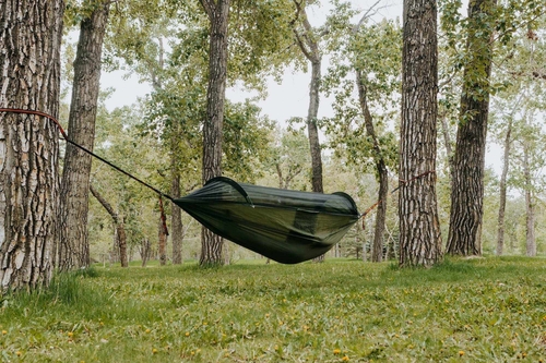The hammock features a convenient side pocket for easy access to essential items. Additionally, the transport bag is securely attached to the outside, allowing for effortless portability.