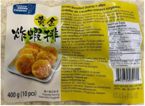 Watson Enterprises Inc. is recalling North Shore Fishery brand Frozen Breaded Shrimp Patties and Frozen Tempura Shrimp Roll because they may contain undeclared egg, soy, and milk, according to the Canadian Food Inspection Agency (CFIA).