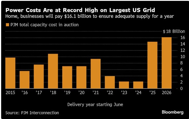 Surging utility bills in key battleground states may become a political risk for Republicans ahead of elections. On the largest US grid, spanning Virginia to Illinois, wholesale power costs have hit records for two years straight. The area includes two states electing governors this fall and four with tight 2026 races. Most of its electricity comes from natural gas, nuclear, and coal, fueling rising prices and voter frustration.