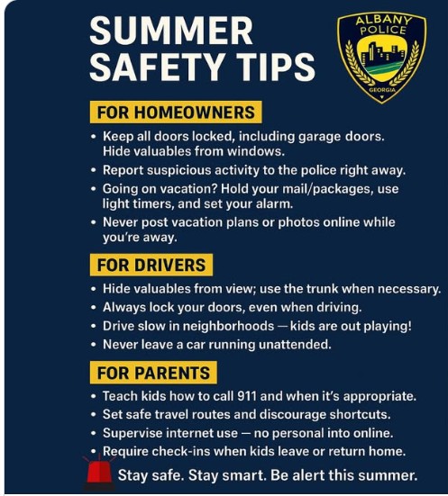 “Hi Tammy, can you please pass this along to the community? This is a quick safety reminder from the Albany Police Department for the good people of Georgia—but really, it applies to everyone. Whether you’re at home, on the road, or watching out for your family, a little extra caution can make a big difference. Let’s look out for each other and keep our communities safe this summer”