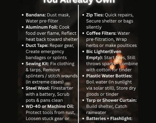 From Brad “12 dual-use survival items you likely already own: Bandanas work as dust masks and water filters. Aluminum foil cooks food and…