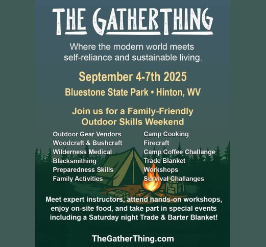 Hey Y’all! Join us at The GatherThing in West Virginia, Sept 4–7, for a weekend celebrating survival, bushcraft, and self-reliance. Learn outdoor skills, try axe-throwing, attend hands-on workshops, explore leather, tools, and more from top vendors, and connect with survival schools and instructors. Build skills, meet like-minded people, and experience living history. Don’t miss this adventure-packed weekend!