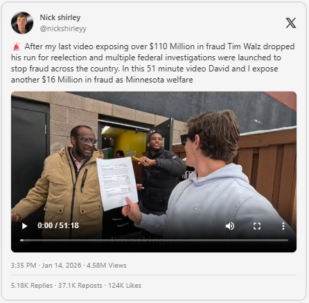 On Wednesday, Nick Shirley released his second video exposing more than %16 million in Somali welfare fraud.