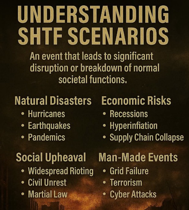 “Hi everyone, this is a repost buy wanted to share with this community. Its a great visual and solid reminder of what real SHTF scenarios look like. From natural disasters to economic collapse, civil unrest, and cyberattacks, it’s clear we all need to stay ready. Take a moment to review your preps”