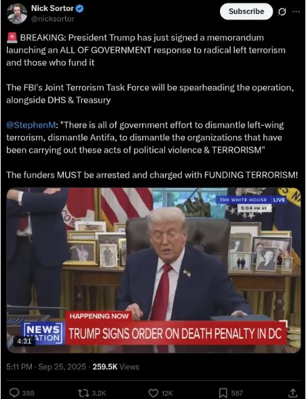 The new order reinforces Antifa’s designation as a domestic terrorist group and widens the focus to include those funding or supporting related violence. In a national address, Trump called it a needed defense of law and order, pointing to recent attacks—including the killing of activist Charlie Kirk and a deadly Dallas ICE shooting—as proof of an organized campaign threatening public safety.