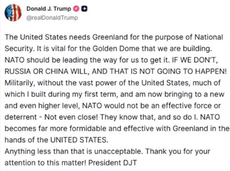 Donald Trump said the U.S. needs Greenland for national security, arguing it is vital to missile defense and broader strategic interests. In a statement issued ahead of meetings with Danish officials, he claimed NATO would be stronger and more effective if Greenland were under U.S. control, warning that without American leadership, Russia or China could gain influence in the region—something he said was unacceptable.