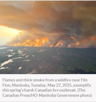 The 2025 Canadian wildfire season is off to an intense start after a warm, dry winter and spring. Over 170 active fires burn mainly in Manitoba and Saskatchewan, with 90+ out of control as of May 29. Fires also rage in northern BC, Alberta, and Ontario. More than 1.5 million acres have burned—an area the size of Delaware. Thousands have evacuated, including two entire towns. Manitoba and Saskatchewan’s Metis Nation have declared states of emergency due to the fires.